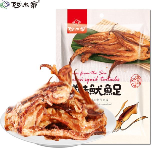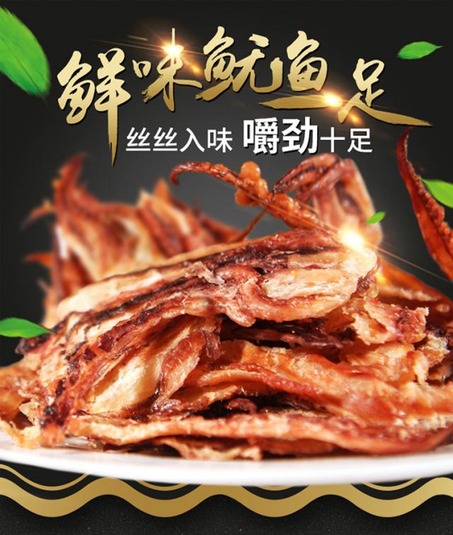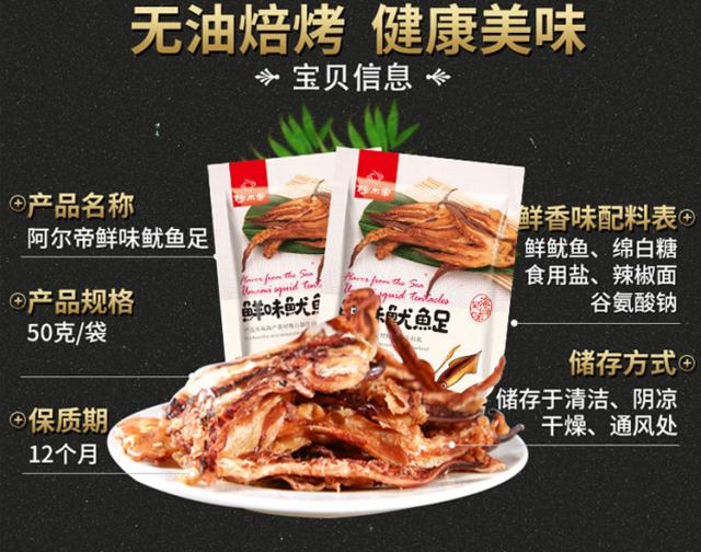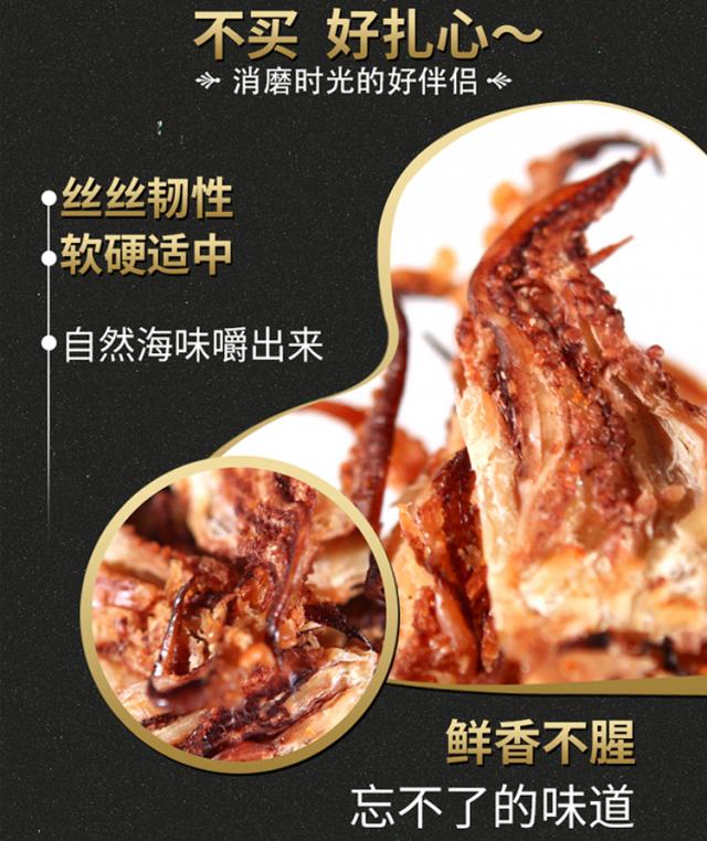 精选优质鱿鱼足。无油焙烤工艺,嚼劲十足。无人工添加防腐剂。鲜甜美味,软硬适中,海鲜零食大明星。休闲、出差、旅游必备零食佳品。