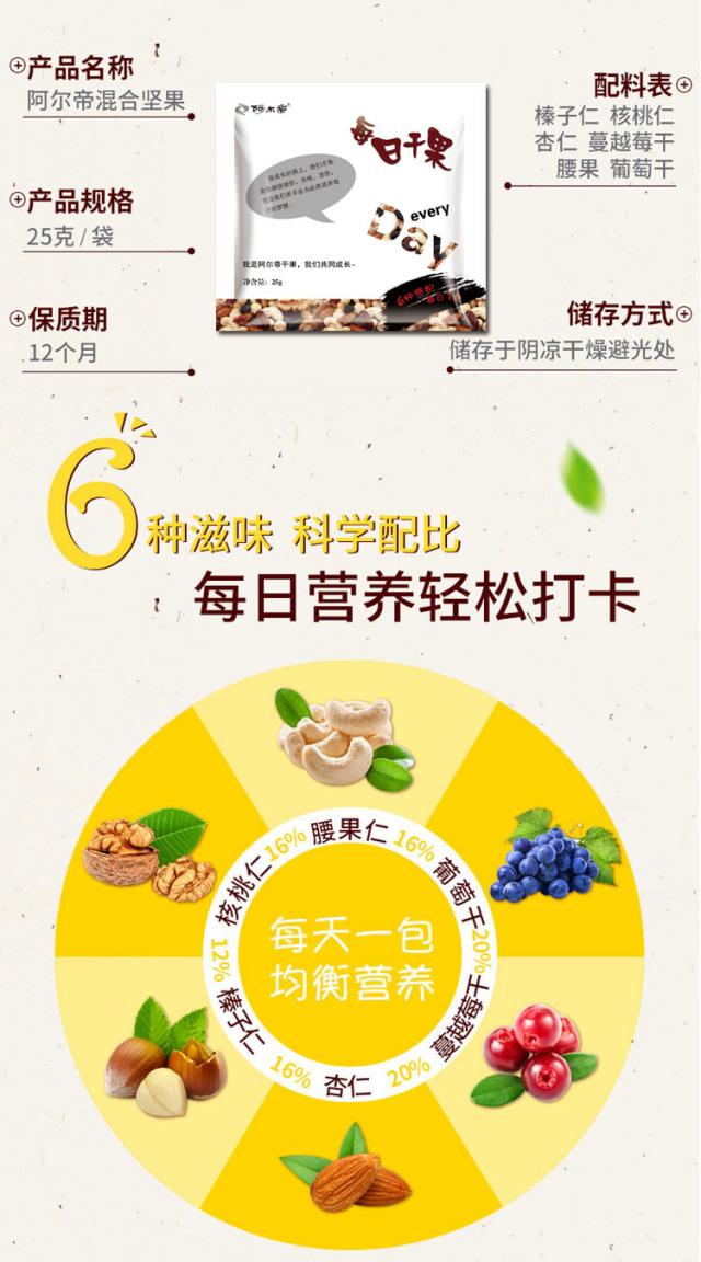 精选6款优质干果,科学配比,补充身体每日干果营养所需,人工精选,保证每一颗质量,无色素,无香精,百变搭配,随心美味。
